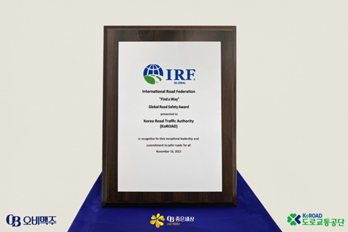 [사진설명: 오비맥주와 도로교통공단이 함께 실시한 음주운전 방지장치 시범사업이 국제도로연맹 (IRF)으로부터 '파인드 어 웨이(Find a Way) 상’을 수상했다. ‘Find a Way상’은 교통사고를 낮추기 위해 정책 개선에 노력한 정부기관에 수여하는 상이다.] (사진제공 오비맥주)