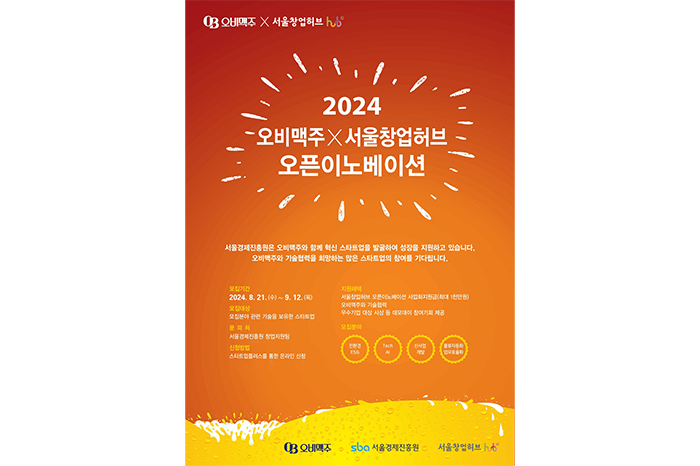 (2024-08-27) 오비맥주(대표 배하준)가 ‘서울경제진흥원’과 함께 혁신 스타트업을 발굴하고 성장을 지원하는 '2024 오픈이노베이션' 참가 기업을 모집한다고 27일 밝혔다.