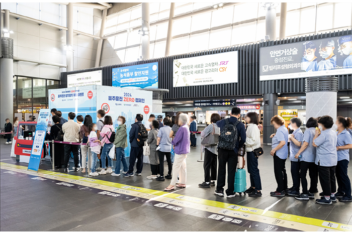 [사진 설명: 오비맥주가 한국도로교통공단, 에스알(SR)과 함께 10월 2일(수) SRT 수서역에서 ‘2024 음주운전 ZERO 캠페인’을 벌였다. SRT 수서역 방문객들이 음주운전 제로 이벤트에 참여하기 위해 줄을 서고 있다. (사진 제공=오비맥주)]