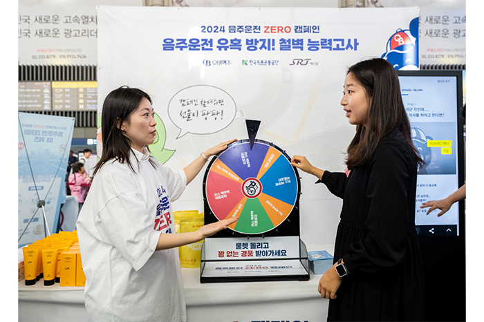 [사진 설명: 오비맥주가 한국도로교통공단, 에스알(SR)과 함께 10월 2일(수) SRT 수서역에서 ‘2024 음주운전 ZERO 캠페인’을 벌였다. SRT 수서역 방문객이 음주운전 제로 캠페인 부스에 참여해 룰렛 이벤트에 참여하고 있다. (사진 제공=오비맥주)]