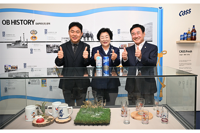 [사진 설명: 왼쪽부터 오비맥주 이천공장 김두영 공장장, 김경희 이천시장, 이천시의회 박명서 의장이 11일 열린 이천 기업열전 전시 ‘오비맥주 연대기’ 개막식에 참석해 기념사진을 찍고 있다. (사진 제공=오비맥주)]