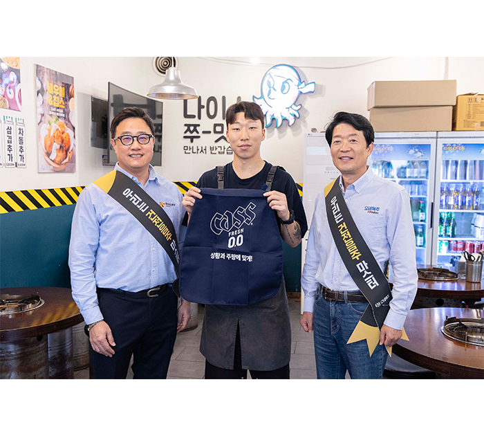[사진설명: ‘글로벌 건전음주의 날’을 맞아 오비맥주 구자범 수석 부사장(오른쪽)이 식당 사장님에게